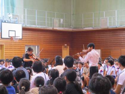 桐朋オーケストラ・アカデミーの演奏を全校で聴きました。バイオリン、ビオラ、チェロ、コントラバスの楽器の組み合わせによって、音色が変化することや演奏の仕方によって音の強弱がでることを実際に鑑賞することができました。