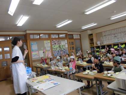今日は、給食の時間に栄養教諭による「栄養についてのお話」を聞きました。それぞれの食材には身体をつくるもの、身体の調子を整えるもの、熱や力になるものがあることを知り、いつも以上にもりもりと食べていました。