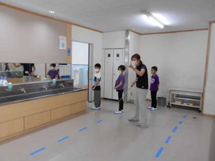 分散登校2日目です。一日の過ごし方やトイレや洗面所の使い方について今日も確認しました。