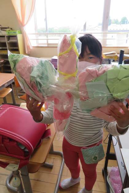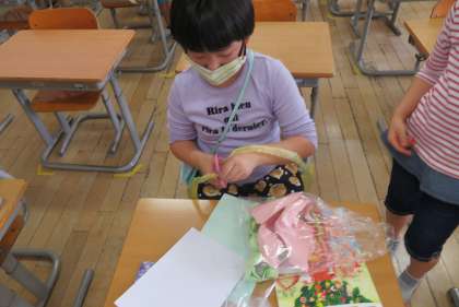 分散登校の1日目、図画工作科「カラフルフレンド」の学習で、ビニール袋と用紙、ひもを使って、想像した友達を作りました。