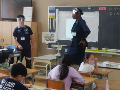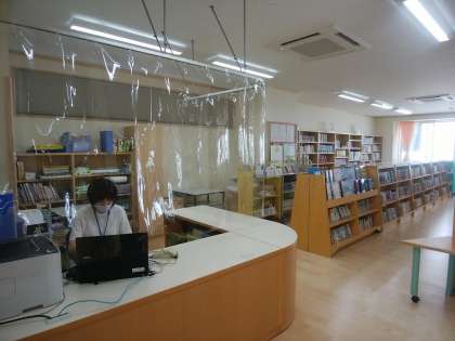 図書室の貸し出しを始めるために、シールドを用務員の岡田さんに取り付けてもらいました。外国語活動では、担任もALTもフェイスシールド着用で授業を行っています。