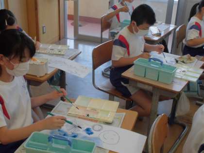 「まぼろしの花を」制作中 4年生 公開日 2020/06/10 更新日 2020/06/10 4年生 4年生は、図画工作科で「まぼろしの花」を描いています。自分だけのオリジナルの花を丁寧に気持ちを込めて描いています。今日は、背景に色を塗りました。完成が楽しみですね。