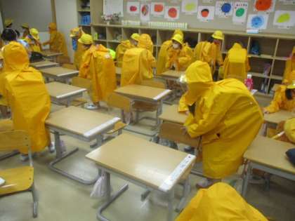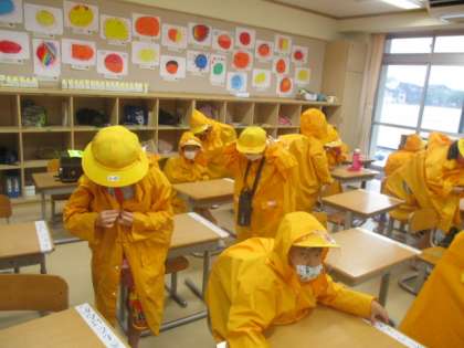 6月11日(木)の下校時に久しぶりに雨が降ったため、1年生は久しぶりに学校でカッパを着ました。休業中にカッパを着る練習をしていたので、みんな素早く着ることができました。