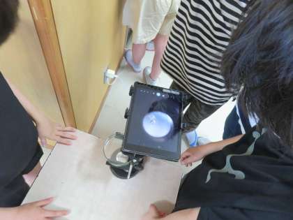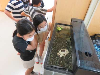 先日、寄贈していただいたメダカを子供たちは毎時間、観察しています。教科書で学んだ雌雄の見分け方と本物を比べ、自分たちで区別しようとしていました。また、メダカのお腹についた卵を見つけては別の容器に移し替え、卵の観察をしていました。