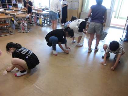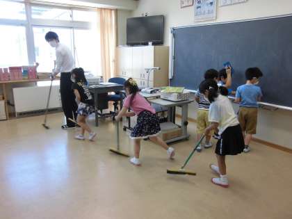 今日から掃除を再開しました。久々の清掃では、熱心に床を磨くなど、友達と協力して取り組む姿が見られました。1年生は、初めての清掃でしたが、「初めてじゃないよ!昨日もやったよ」と、昨日掃除の練習をしたことも誇らしげに言いながら、張り切って掃除していました。掃除後の手洗いをしっかりすることにも気を付けて取り組んでいきます。