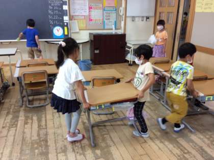 とうばんかつどう 公開日 2020/07/03 更新日 2020/07/03 1年生 初めての清掃や給食当番が始まりました。ぞうきんがけを一生懸命行ったり、重い机を友達と協力して運んでいます。「クラスのためにできることをがんばろう」という思いをもって、毎日頑張っています。