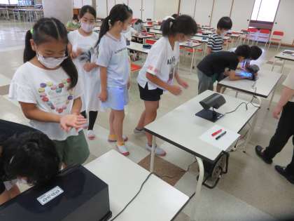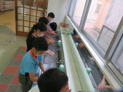 学校では、休み時間後や清掃後に全校で手洗いに取り組む時間があります。今日は、養護教諭からの指導を受けながら、今までの手洗いの仕方を見直しました。