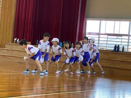 体育科の学習では、表現遊びを行っています。遊園地の乗り物になりきって友達と楽しく活動しました。