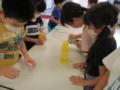 算数科の学習では、様々な大きさのマスに水を入れ替えながら、水のかさの単位を学習しています。