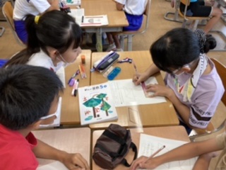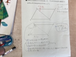 合同な図形 公開日 2020/08/04 更新日 2020/08/04 5年生 5年生は現在、算数科で「合同な図形」の学習をしています。今回は合同な平行四辺形をかき、その手順を同じグループの友達に作図しながら説明しました。分かりやすく説明しようとする姿が見られました。