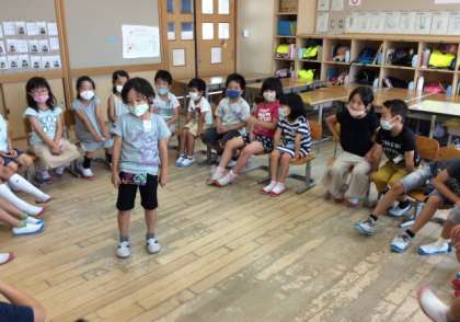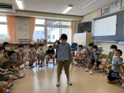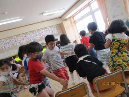 たのしかったよ、つどいのじかん 公開日 2020/08/27 更新日 2020/08/27 1年生 水曜日の集いの時間に、各学級でお楽しみ会をしました。いす取りゲームやなんでもバスケット等をして、みんなで楽しみました。