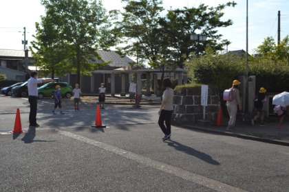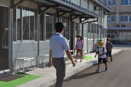 新しい玄関から 公開日 2020/09/01 更新日 2020/09/01 最近の出来事 2年生から6年生までの子供たちは、新しい玄関(仮設校舎内)を使用することになりました。 1年生だけは、旧校舎の児童玄関をしばらく使用し続けます。 正面玄関前では、職員が子供たちをそれぞれの玄関へと誘導しています。