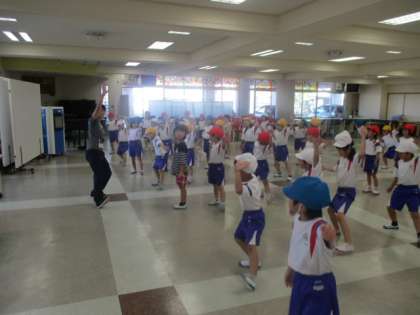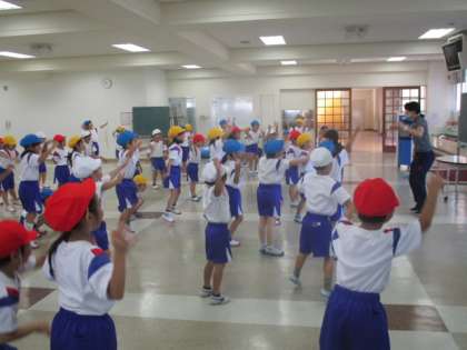 1年生は、体育の時間にまねっこあそびをしました。先生をよく見て、いろいろな動きを真似することができました。