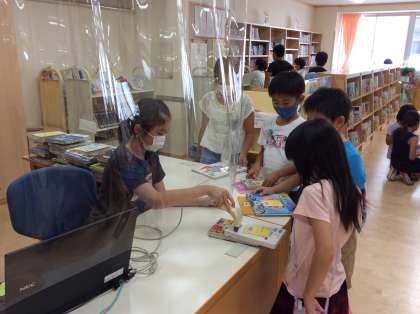 図書室の様子 公開日 2020/09/03 更新日 2020/09/03 図書室より 新型コロナウイルス感染防止対策で貸し出しカウンターにはビニールカーテンを用いています。今日も、休み時間に本を借りようとする子供たちが図書室を利用していました。