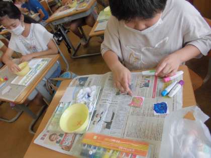 たくさんの色を重ねると・・・ 公開日 2020/09/16 更新日 2020/09/16 4年生 図工の学習では、絵の具を指で描き、色合いの学習をしました。「あっ、この色とこの色でこんな色になるんだ!」「おもしろい形になったよ。」など、とても楽しく描くことができました。