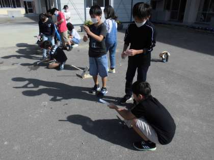 4年生は理科で「とじこめた空気や水」の学習をしています。空気と水を入れた筒にスポンジで栓をし、発射台の棒で圧してスポンジを飛ばす「スポンジロケット」を使い、どうすればスポンジが遠くに飛ぶのか考えています。一人一人が自分の予想をもったり、実験方法を考えたりしながら追究しています。