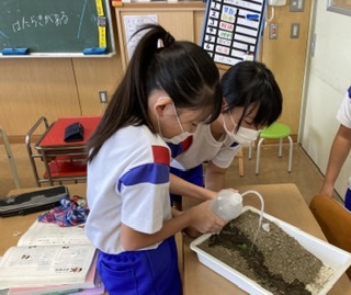 流れる水のはたらき 公開日 2020/10/01 更新日 2020/10/01 5年生 5年生では、理科で流れる水のはたらきについて学習しています。今回は、バットに土砂を盛り、山と川を再現しました。そして、山から水を流し、水が流れた部分がどのようになったのかを観察しました。子供たちは水が流れると土が削られることや、土砂が流されることに気付き、ノートにまとめたり、発表したりしました。