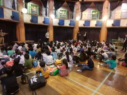 こどもみらい館に到着しました。ホールで先生の話を聞いています。これから、学級ごとに分かれて活動します。