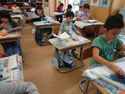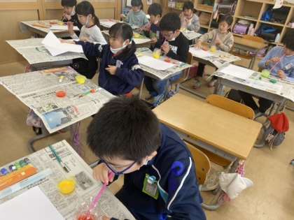 図画工作科の学習で、しゃぼん玉アートをしました。