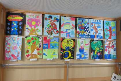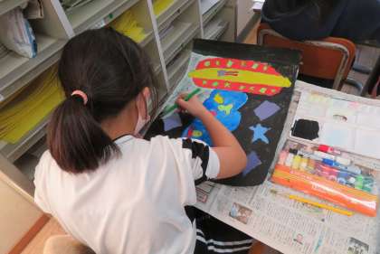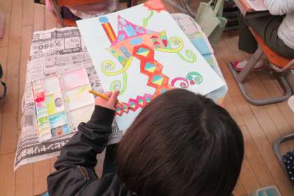図画工作科では、「こんな木あったらいいな!」という題材で、絵を描きました。「魚が泳ぐ木」や「宇宙にある木」、「おいしい食べ物の木」等、想像を膨らませがら、楽しく下絵を描き、色を丁寧に塗りました。「こんなすてきな木があったらいいね!」という作品になりました。