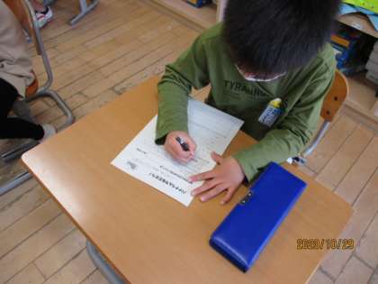 バナナうんちをだそう! 公開日 2020/11/13 更新日 2020/11/13 1年生 1年生は、排便の役割や大切さについて学習しました。養護教諭からバナナうんちを出すための方法を聞いて、自分が頑張りたいことをワークシートに書きました。「バナナうんちを出すためにちゃんと野菜を食べたい」「早寝早起きをがんばりたい」と目当てを立ててがんばっています。