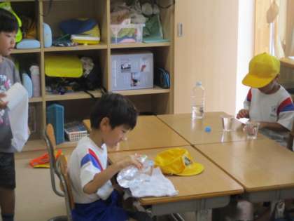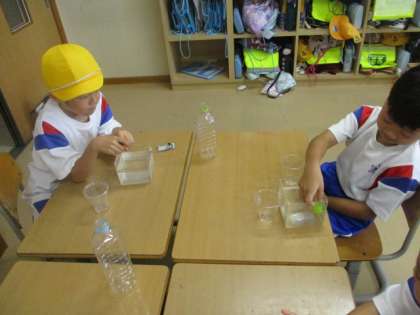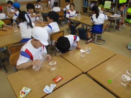1年生 算数科 どちらがおおい 公開日 2024/10/03 更新日 2024/10/03 1年生 2種類のペットボトルに入った水の量を比べました。同じ容器に移すことで比べられることに気付いていました。