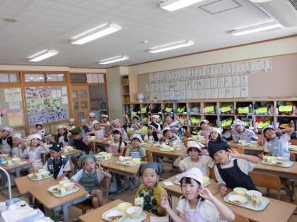 1年2組は、久しぶりに全員揃いました。校内放送で速星小学校ができた日だということを知ると、「すごい昔から始まったんだね」「速星小学校はおじいちゃん、おばあちゃんなんだね」と楽しそうに話していました。クラスのみんなで会話したり、微笑みあったりして食べている子供の姿が素敵だなと思いました。