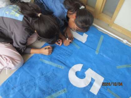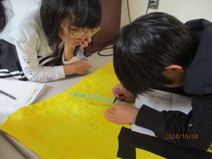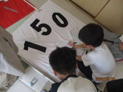 4年生 団旗を完成させよう1 公開日 2024/10/04 更新日 2024/10/04 4年生 150周年記念の団旗に、メッセージを書きました。「おめでとう」「ありがとう」など、お祝いする言葉でいっぱいになりました。