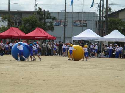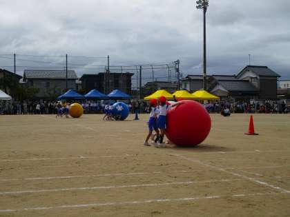 1、2年生の団体競技は、大玉転がしです。1年生が押して、2年生が方向や速さを調整していました。