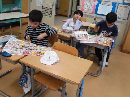 チラシや野菜などの袋、値札のシール等から、どんなものがどこから仕入れられているのかを知りました。