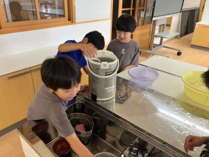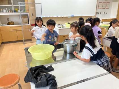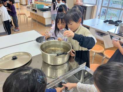 1年生 算数科 どちらがおおい 公開日 2024/10/19 更新日 2024/10/19 1年生 家庭科室にある鍋や桶、フライパン等に、同じ大きさのコップで水を入れ、どの容器が一番多い量が入るのかを調べました。