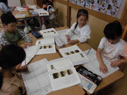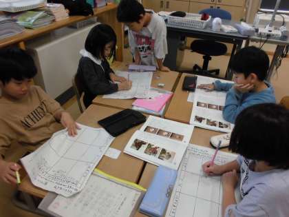 今日は、教科書を読み、それぞれの生き物の特徴を確認しました。4人グループになり、「たこのかくれている場所はどこだろう」「このページに書いてあるよ」と会話しながら取り組んでいました。