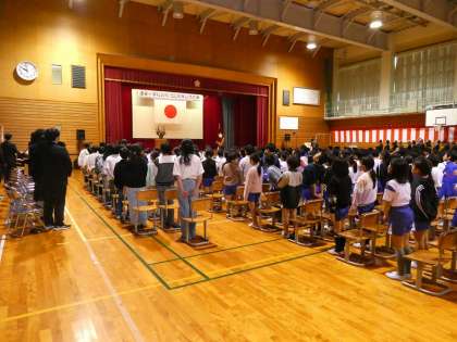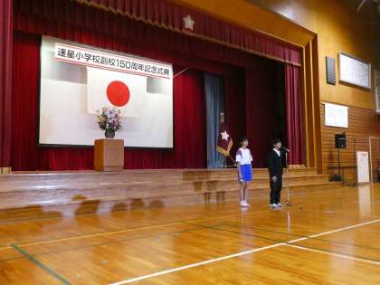5年生の子供たちが総合的な学習の時間に調べ学習をしている「速星校区のいま・むかし」と題し、小学校の歴史や校歌などについて発表しました。また、児童の言葉として6年の子供から「歴史と伝統ある速星小学校に誇りをもち、元気に明るく思いやりの心をもって生活していきましょう」と全校みんなに伝え、速星小学校をよりよくしていこうとする思いを新たにしました。