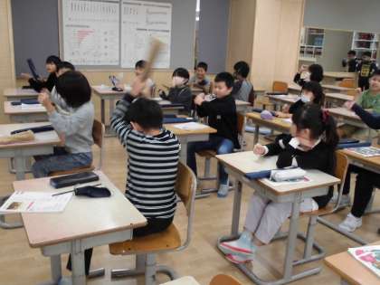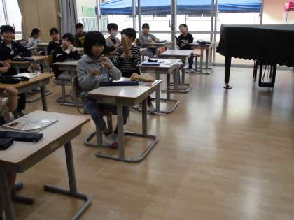 3年生 音楽科「旋律の重なりを感じとろう」 公開日 2024/10/31 更新日 2024/10/31 3年生 「アルルの女」第1曲から「かね」を鑑賞しました。曲に合わせて鐘を打つまねをしたり、旋律を聴きながら図形楽譜を指でなぞったりしました。