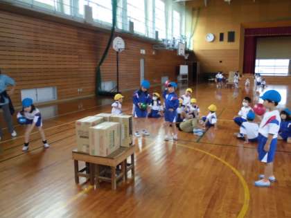 この日の時間の最後に、段ボールにボールを当てて落とす「段ボール当てゲーム」をしました。狙いを定めて、元気いっぱい投げる子供たち。「どうやったらはやく段ボールを落とせるかな?」と話し合ってる色団もありました。