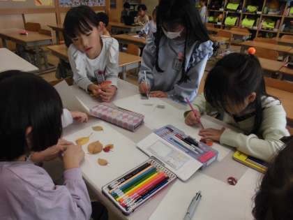 天気がよかったので、グラウンドに出てみると、葉っぱが赤や黄に色づいていることに気づいた子供たち。大きさや色づき方、生き物に食べられた葉など、一つ一つ違う形に興味心身な様子でした。