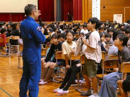 子供たちから「宇宙での食べ物はどんなもの?」「宇宙ではどうやって寝るの?」「宇宙で涙を流すとどうなるの?」「宇宙でけがをしたらどうするの?」「宇宙で野菜は育つの?」「宇宙以外に生物はいるの?」「宇宙服はいくらするの?」などの興味関心をもった質問に、星出さんは子供たちのそばで丁寧に教えてくださいました。