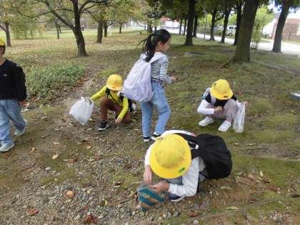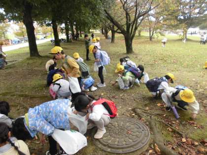 昼食後は、班のみんなと「秋見つけ」を行いました。環水公園には、赤や黄色に色づいた落ち葉、どんぐりがたくさん落ちていました。「先生!見て!どんぐりに帽子がついているよ!」「大きいものと小さいものがあるよ」「小さいどんぐりは、緑色なんだ」と話している子がいました。「秋みつけ」の中にも新しい発見がどんどん出てきていました。