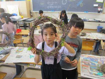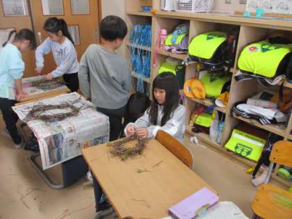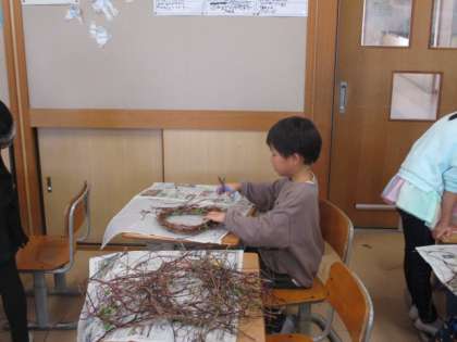 育ててきたアサガオのつるを使ってリースづくりをしました。つるを支柱から外し、円にして、リースの形にしました。