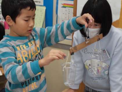 一円玉の枚数でも、重さを計って比べました。みんな、真剣です。