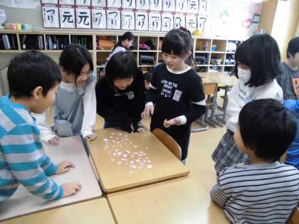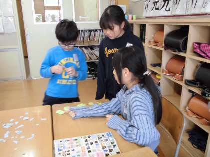 英語でやりとりしながら、自分たちで作った形を集めています。