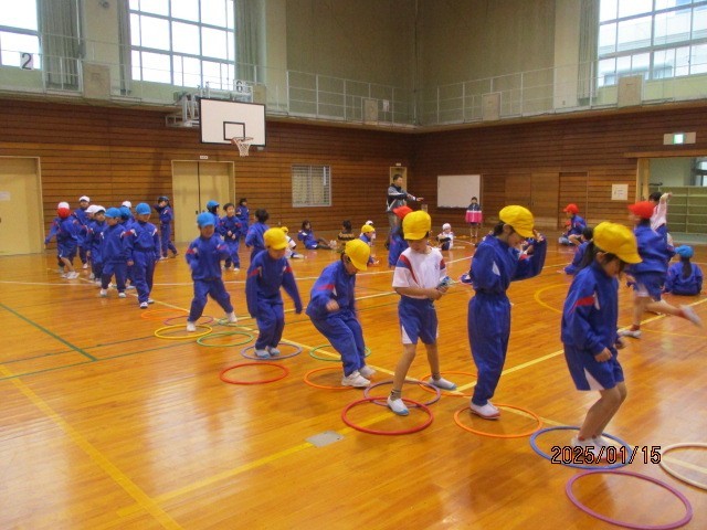 今日は、準備体操で両足ジャンプの「けんけんぱ」を行いました。足を揃えてジャンプするのって意外と難しいんですよね。子供たちも一生懸命ジャンプしていました。