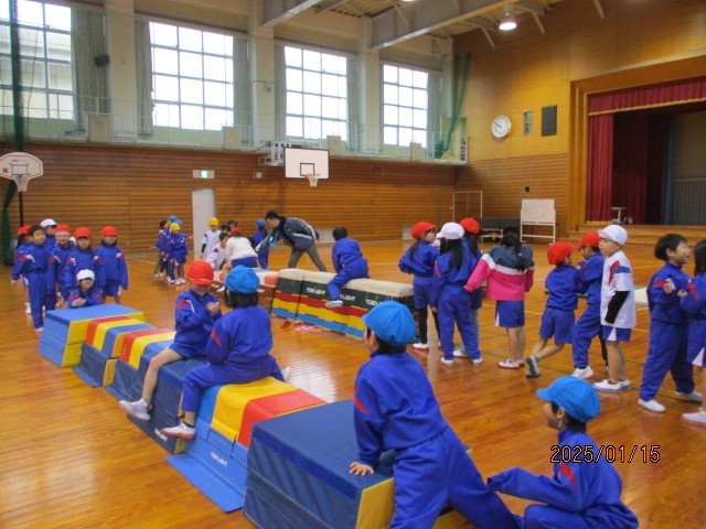 その後、「跳び箱じゃんけん」にチャレンジしました。「負けないぞ!」とメラメラ燃えている子がいました。手で身体を支えながら、前に進む動きに取り組むことができました。