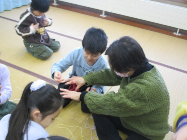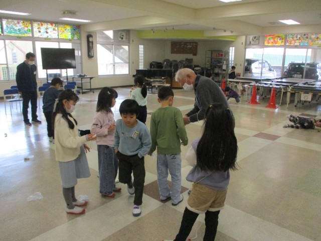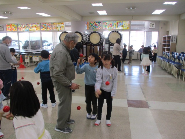 地域の長寿会の方々をお招きして、けん玉やこま、あやとり、おはじきなどの遊びを教えていただきました。みんな楽しんで活動に取り組みました。