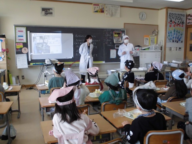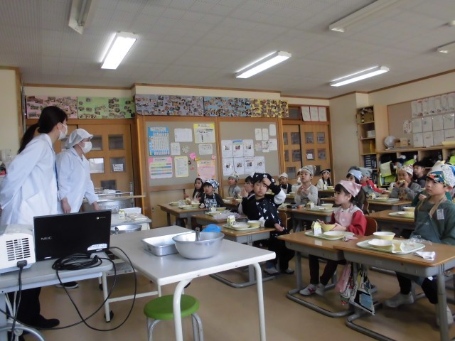 今日は、毎日おいしい給食を作ってくださっている調理員さんと栄養士さんをお招きして、お話を聞きました。朝早くから作っていること、大きなボールや釜を使って約600人分の給食を作っていることなどを知り、子供たちは驚いていました。「残さないように食べたいな」「調理員さん、いつもありがとう」と話している子がいました。