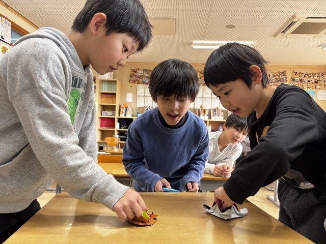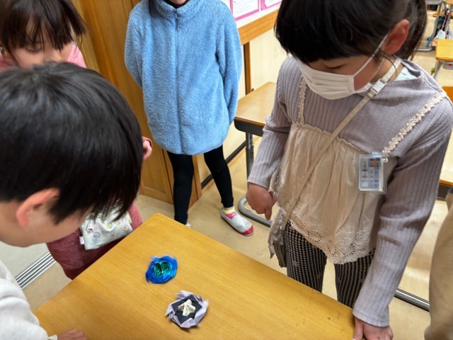 図工係の子供たちが「ベイブレード大会」を企画しました。折り紙で作ったこまを使い、トーナメント形式で対戦しました。