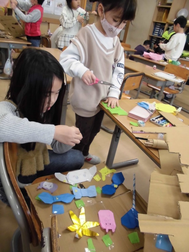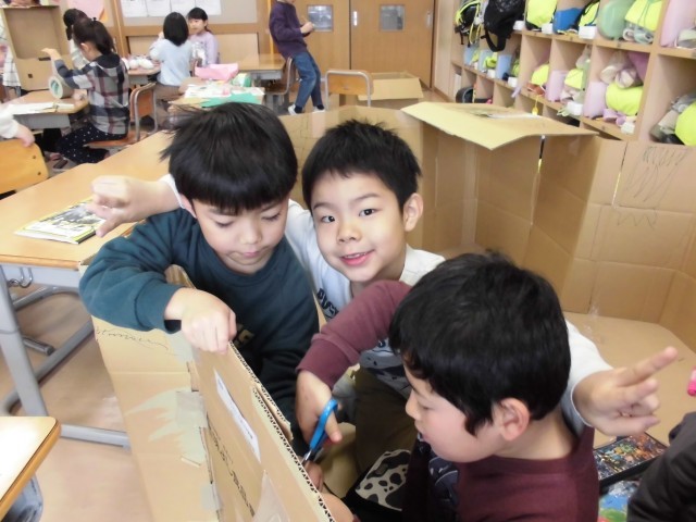 1月30日(木)にある新入生体験学習に向けて準備を頑張っています。「年長さんに楽しみな気持ちで入学してきてほしいな」「速星小学校の素敵なところを紹介したい」という願いをもって、ゲームや学校を紹介するための道具や掲示を作成中の1年生。