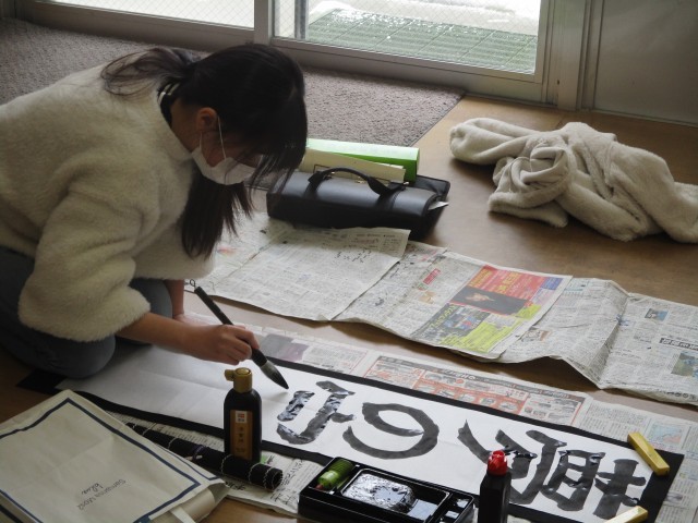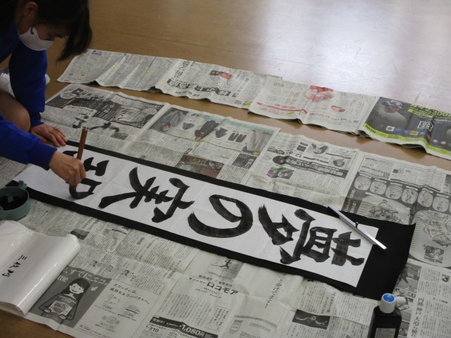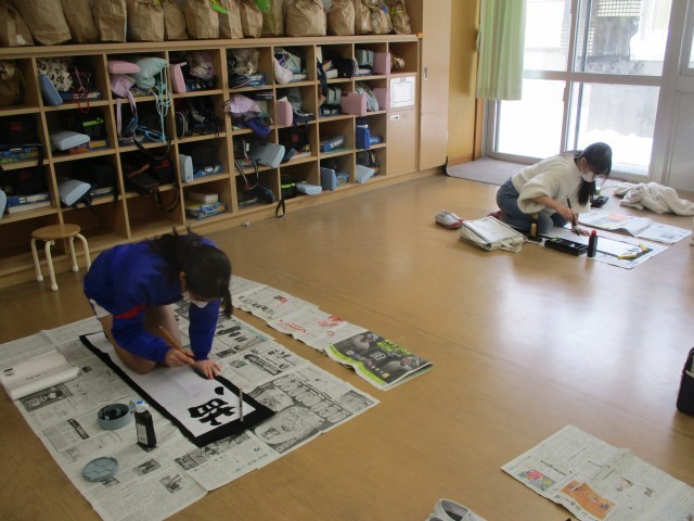 来週開催される書き初め大会に向けて学年代表の二名が一生懸命練習しています。一筆一筆大切に丁寧に書きました。お見事!