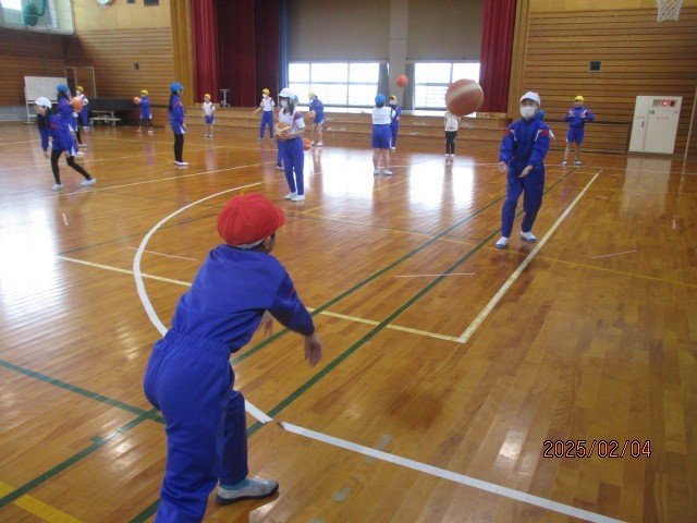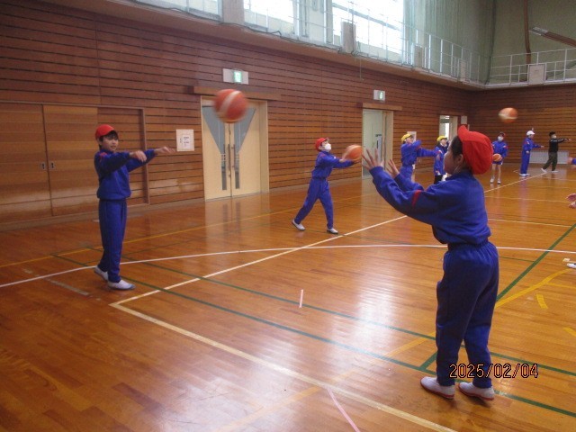 バスケットボールを使って、パス練習を行いました。しっかり踏み込んでから、ボールを投げていました。