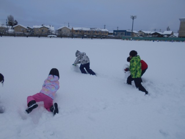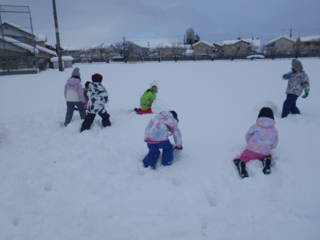 校庭に積もった雪で遊びました。雪だるまを作ったり、雪合戦をしたりしました。